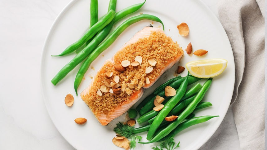 This almond-crusted salmon and asparagus recipe is a delicious and healthy option that's perfect for anyone looking to increase their protein intake and lower their carb intake. The salmon is coated in a crispy almond crust and served alongside tender, roasted asparagus. It's an easy-to-make dish that's sure to impress your taste buds while also being a great choice for anyone following a diabetic-friendly, low-carb, or high-protein diet.
